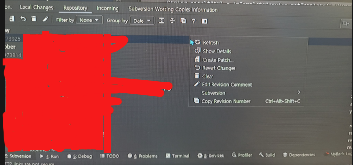 1. 73814 커밋 내용을 클릭 한 후 오른쪽 마우스를 클릭해 'Revert Changes'를 클릭한다.